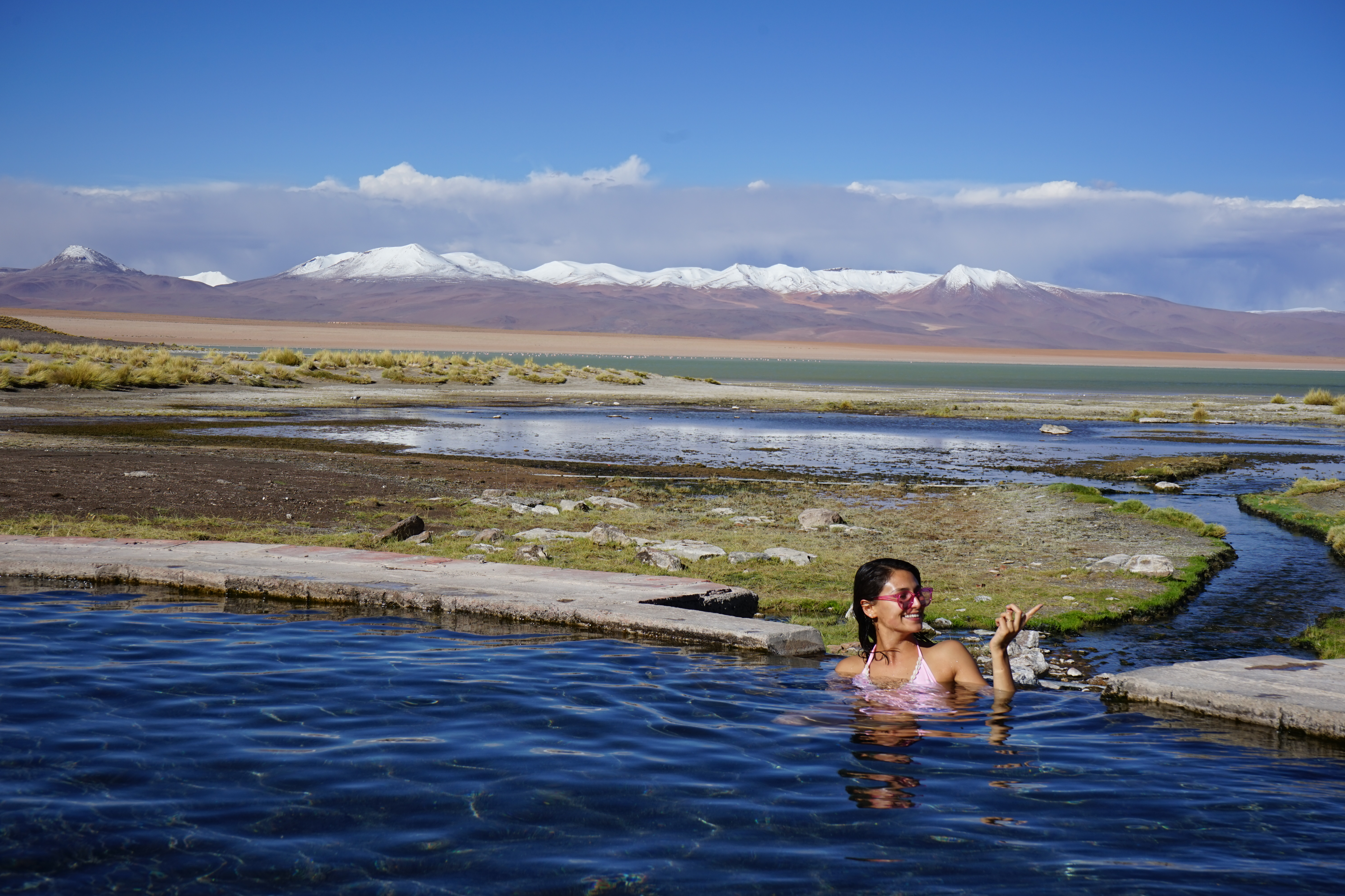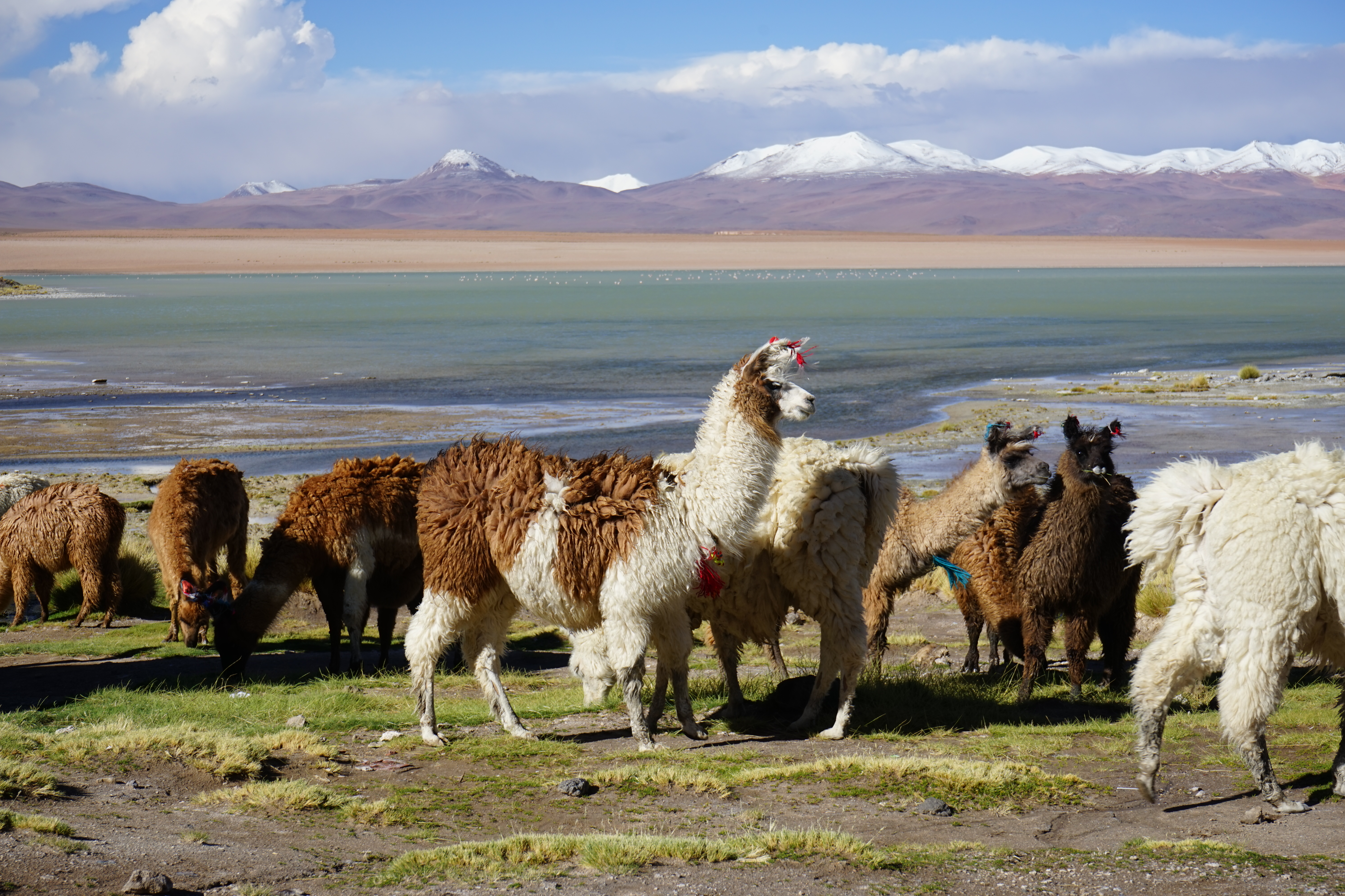 Altiplano signifie « plaine d’altitude » en espagnol. Située au cœur de la Cordillère des Andes c’est la plus haute région habitée après le plateau tibétain. Pour s’aventurer sur cette zone en solitaire il faut pas mal d’inconscience ou une sacrée paire de couilles. Je te laisse deviner ce qui me revient. Toutes les agences de la région nous ont clairement dit qu’il fallait y aller en tour organisé. Et que c’était trop dangereux autrement. J’en ai conclu qu’encore une fois ils essayaient de nous vendre leur service. Mais la raison en est tout autre. Ces plaines sont situées entre 4000 et 5000 m d’altitude, il y a 300 km jusqu’à Uyuni et aucune route tracée. Ce sont des petits chemins de terre au milieu des montagnes et il y est facile de se perdre. Seulement ça, on l’a compris une fois qu’on y était. Heureusement la météo est parfaite et c’est tellement beau qu’on en oublie vite l’inquiétante immensité des lieux. Des lagunes de couleurs blanches et vertes, des chemins de terre rouge à travers des cols enneigés et des eaux thermales au milieu de troupeaux de lamas. Que dire de plus ? C’est juste la route la plus sauvage que j’ai prise jusqu’à présent.